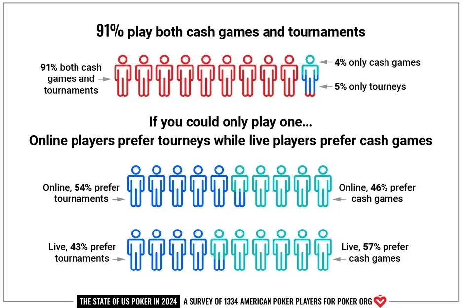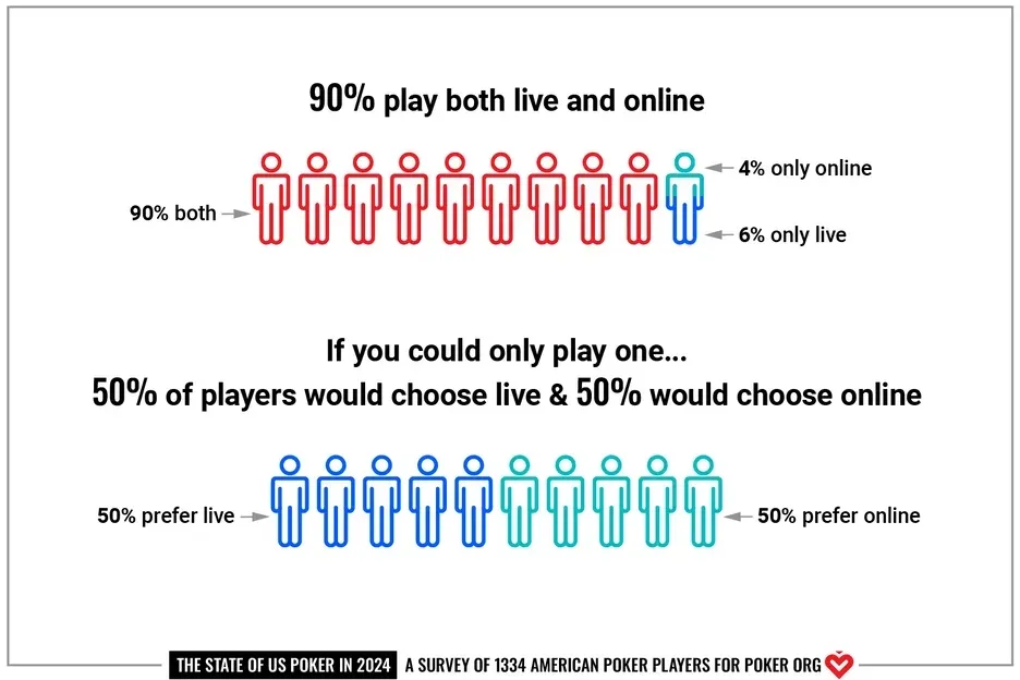 还是……有分歧?也许没有:在我们的调查对象中,90%的人既喜欢现场扑克也喜欢线上扑克,6%的人坚持现场扑克,4%的人只喜欢在线扑克。然而,如果让受访者选择只玩现场扑克或只玩在线扑克,受访者的比例则各占一半。看来还是有分歧的。