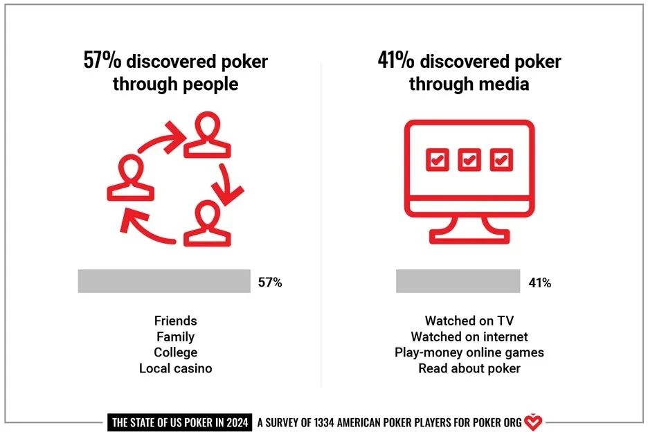 大多数受访者(57%)是通过朋友和家人、在大学时或通过朋友带他们去当地的牌室了解扑克的。