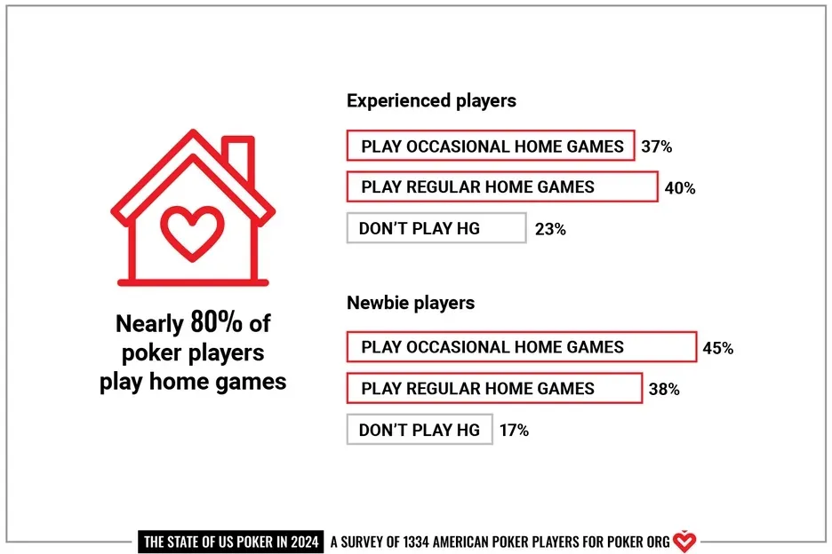 对于新玩家来说,这一数字还会上升,其中38%的玩家经常玩家庭游戏,45%的玩家偶尔玩。这使得17%的新玩家在网上或在现场和公共牌室开始玩游戏,在这些地方,新手像下注一样的动作和不按顺序行事的行为不会那么容易被忽视(别担心,我们都经历过)那里)。