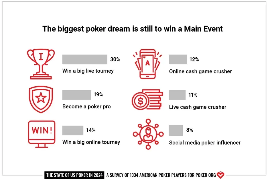 听到这个消息可能并不奇怪,但世界冠军手镯仍然是当今扑克界最令人垂涎的奖品。更多玩家希望赢得像WSOP主赛事这样的大型现场锦标赛,而不是成为现场或在线常规桌游戏粉碎者、参加大型在线锦标赛或成为社交媒体影响者。哎呀,更多的人想赢得大奖,而不是成为一名全职扑克职业选手。