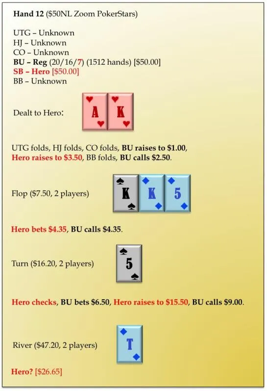 我对自己的转牌圈加注非常满意。它放弃了少数有平衡意识的常客玩家,但对于赚取在这里有太多TT的更常见对手的资金起到了很好的作用。这说明了对抗思考型牌手时存在一个常见漏洞的危险。