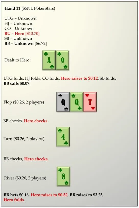 这极不可能是任何接近平衡的策略或偏于于诈唬的策略。在这种对手据知不是很疯狂的场合,我们的法则是:如果你不能打败至少一部分最常见的坚果牌,那么你弃牌。这里我们无法打败任何葫芦,而鱼玩家很可能无明显理由地一直慢玩QT和TT。