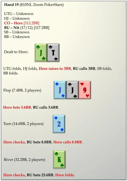 对抗一个厉害的平衡或激进对手,我们将在这个翻牌面频繁check。JTo甚至有资格充当意图抓三连注诈唬的check-call牌。对抗一个更活跃的牌手这手牌适合充当这个角色,因为这是我们可以拿到的最弱Jx牌之一,因此它作为一手连续三次价值下注牌没有KJ那么好。