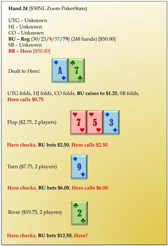 在这个牌面,我们有一张积极阻断牌:7和一张半积极阻断牌:A。后者只是半积极的理由是:它阻断了一些诈唬牌(如转牌圈拿到的同花听牌,卡顺听牌)和一些价值牌。