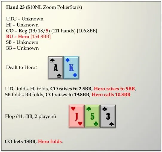 大多数常客玩家,甚至更紧的常客玩家,能够用他们的4bet诈唬牌在这个翻牌面做较小尺度下注。AK对抗任何包括少数4bet诈唬牌的范围有极合理的胜率和摊牌价值。同样,我们预计具有这种统计数据的普通常客玩家有时在后面位置4bet诈唬。