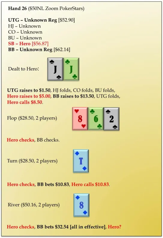 大盲玩家拿着JJ这样的一对的时候会怎样?加注很可能将这些牌逐出底池,而这些牌肯定至少会跟注这个翻牌圈下注,而且可能在大多数转牌面继续跟注。