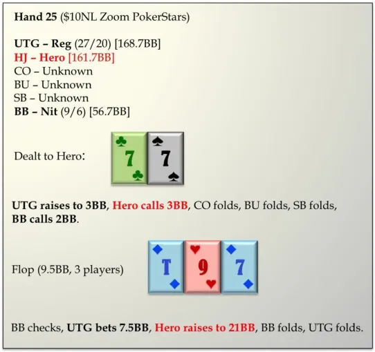 因为大盲位置有一个已知的紧弱玩家(Nit),Hero少了一个他不得不担心的压榨加注者,而“用所有牌跟注”策略变得比之前更好。Hero的翻前玩法是可行的。