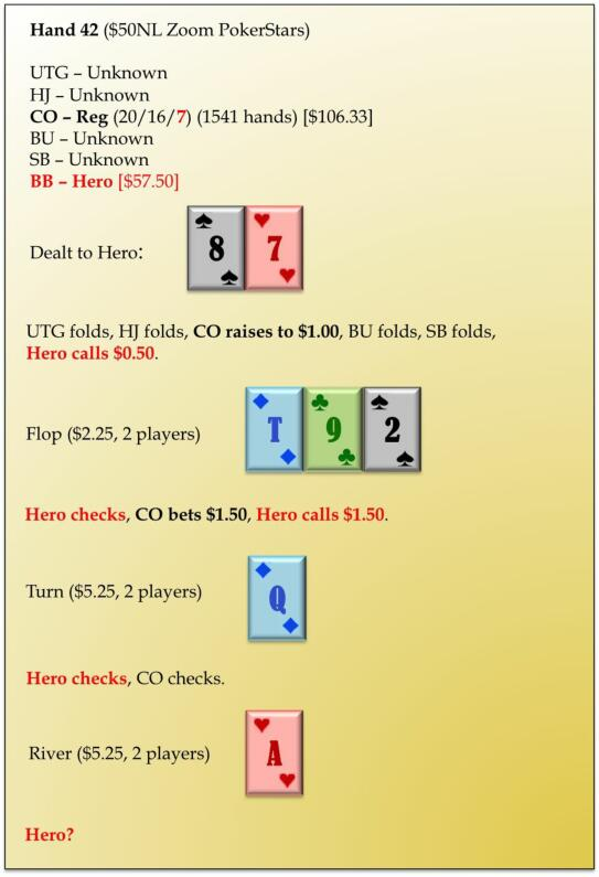 对手随后check,因此那些有趣的分支都不会发生。但是,真实分支可能更有趣。对手的转牌圈check对他的范围有何影响?它肯定受限于一对或更差的牌。河牌使得两个牌手有许多顶对、两对等牌。