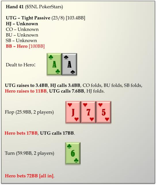 转牌圈全压似乎太薄。只因为我们想要翻牌圈下注并在转牌圈全压并不意味着我们在搞糟了底池增长率之后必须死板地坚持原计划。使得这个弱手现在用他的坚果同花听牌非常明显的弃牌是一件极糟糕的事情。相反,通过下注约40BB,Hero从这些牌(它们只有20.5%胜率,无法有利可图地追逐听牌)那儿得到更多价值,而且我们可以开心地在红桃河牌面check-fold。