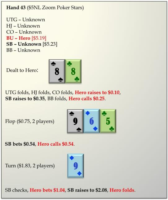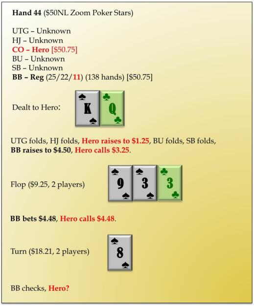 事实上,我们处于NL5级别Zoom局玩家池,这里的常客玩家若没有良好胜率通常不会在3bet底池的转牌圈诈唬。在彩虹转牌面和空白转牌面,他们无疑会诈唬不足(underbluff),因此我们应该过度弃牌(overfold)。