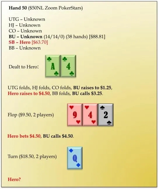 转牌圈是一个很有趣的场合,将我们的牌转变成诈唬牌而不是温顺的check-fold牌可能是种诱惑。显然,在转牌圈用这样一手弱牌check-call是不合适的,这个转牌面击中了大量飘浮跟注牌,用check-call玩法对抗这些牌通常是寻求抓诈唬。用这手牌下注的麻烦是把诈唬范围弄得太大,与我即将定义的我如何处理这种场合的策略不相符。