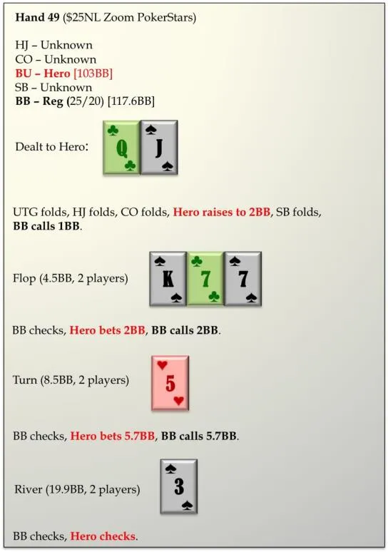 策略2是不太两极化的选择。我们在这里做较小的融合下注,旨在保护更多底池权益和更频繁地给对手的翻牌圈飘浮跟注牌施压。在这种策略中我们当前的牌仍然是一手下注牌,因为具有一个较宽的价值下注范围为我们提供了更多诈唬牌,即使较小的尺度同样限制了我们的诈唬牌数量。在这种模式中我们应该有时仍然用一手中等强牌在转牌圈随后check,但频率低于策略1。对抗在翻牌圈用他们的范围对我们的小尺度下注过度跟注的牌手这是一个更好的主意。当大多数人在翻牌圈玩得太紧时更两极化的策略更好。我预计在这种玩家池更可能遇到后者,因此我会用策略2对抗比Nl25级别Zoom局大多数牌手更厉害的对手。