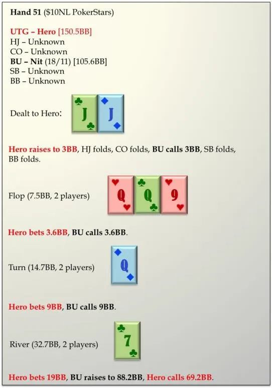 这个错误往往被人用cooler的一个错误定义当作借口。毕竟,没有比放弃最好牌更糟糕的事情,对吗?错。为1%的胜率投入69BBB是比这糟糕得多的事情。