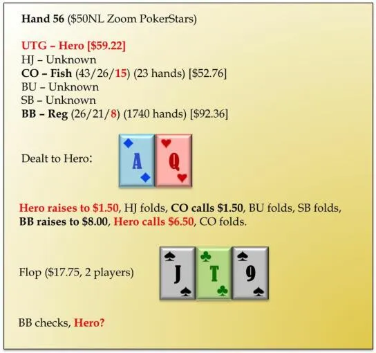 l 我会其余牌随后check,而且在大多数转牌面至少跟注一次。对手在这里有太多AQ-AK,因此,如果他不注意,他很容易在转牌圈过度诈唬。
