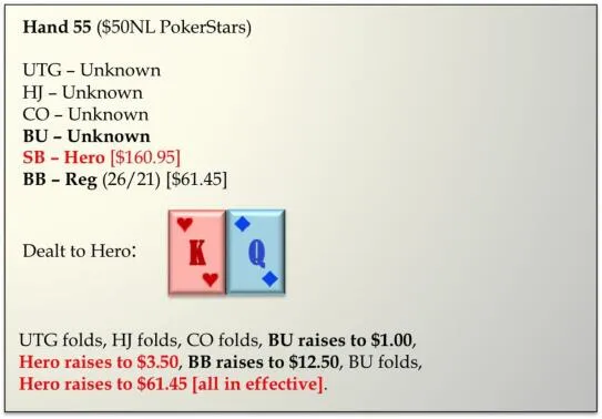 Hero的3bet范围将难以找到太多胜率比KQ差的半诈唬牌。因此Hero要么诈唬太频繁,要么为这项任务使用了完全错误的组合。从平衡的角度来看,Hero的玩法意味着一种极不平衡的策略,它可能被对手很可能采用的偏重价值牌的策略摧毁。