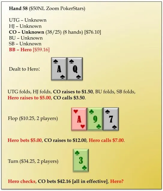AQs对抗两种类型的牌手都是不假思考的3bet牌,因此我们这么做,但我们从现在起把对手当作一个弱手。