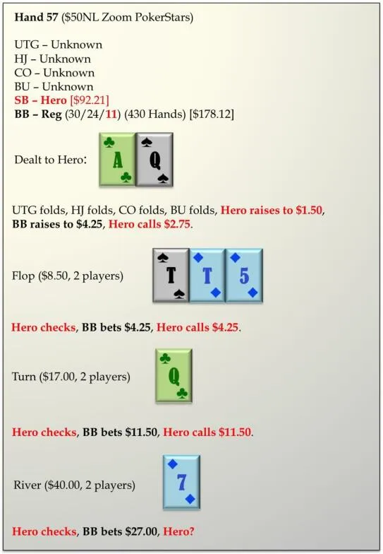 河牌对于我们的无方块底牌组合远非理想。如果我们有一张方块,我们将很好地阻断对手的同花。因为对手似乎很激进,我将避免应用我在NL50级别的通常阅读——他们在河牌圈诈唬不够多。对抗这个对手,我建议学生在河牌圈退而用一种平衡的跟注频率。