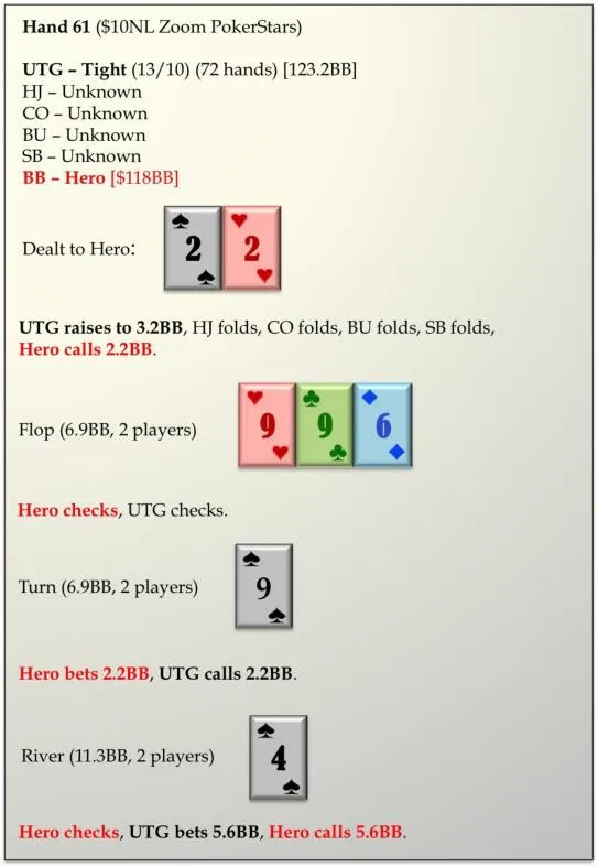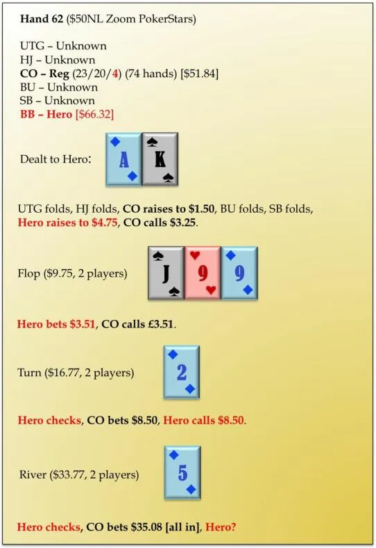 任何一张小于J的河牌在这里都是纯粹的空白牌(brick)。在河牌圈check对我没有任何意义。Hero在提交牌局时说,对手不可能拿到任何价值牌,因此我们应该check-call。我并不讨厌这种逻辑,但check往往只会导致我们直接摊牌(我们本可以从32种以上没有任何理由下注的两张大牌组合那儿榨取一点儿价值)。为什么一个已采用底池控制玩法的紧弱玩家会决定在河牌圈用具有摊牌价值的牌下注呢?因为他玩得糟糕?也许吧,但这只会导致他极少数时候下注。