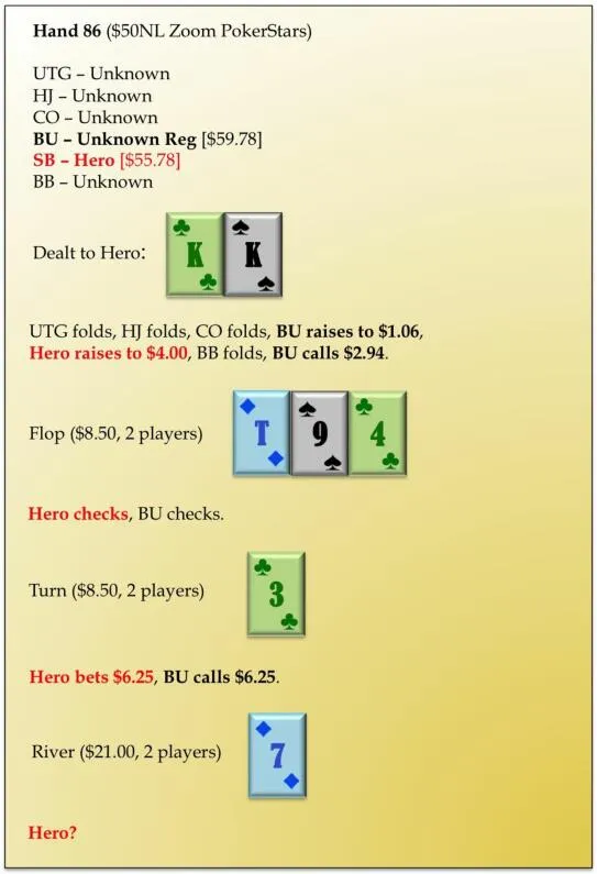 无论如何,慢玩KK不是因为我们认为它是战术上最优的,而是因为:为了采用一种涉及到用一些牌check-fold的理想策略,我们必须有时用这手牌check。慢玩是纯战略的,而且我们希望弥补由于略过价值下注损失的任何真空EV。我们通过从对手的诈唬牌(如果我们主动下注,这些牌不会跟注)那儿赚取资金来做到这点。在这里用KK过牌(check)有一些优点和缺点,但它是一手值得放入check-call范围的相当稳定的强牌。Check-call范围的整体EV因为包括KK而提升,涉及check的策略的整体EV也因此提升。