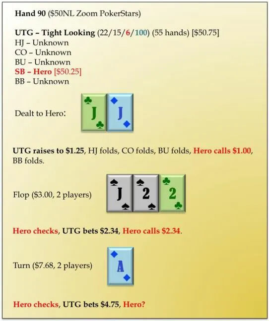 转牌圈是情况变得更有趣的地方。在翻牌圈,有人说由于我的牌阻断Jx牌,我做了一个糟糕的加注。但是,当对手在这个转牌面第二次下注时,他的价值下注范围转变为和我们完全无关的AQ、AK。因此JJ在这里是一手极好的价值加注牌。我们在这里可能考虑加注的另一手牌是AJ,但由于它减少了我们预计他会bet-call的顶对组合,AJ明显比JJ没那么适合check-raise。
