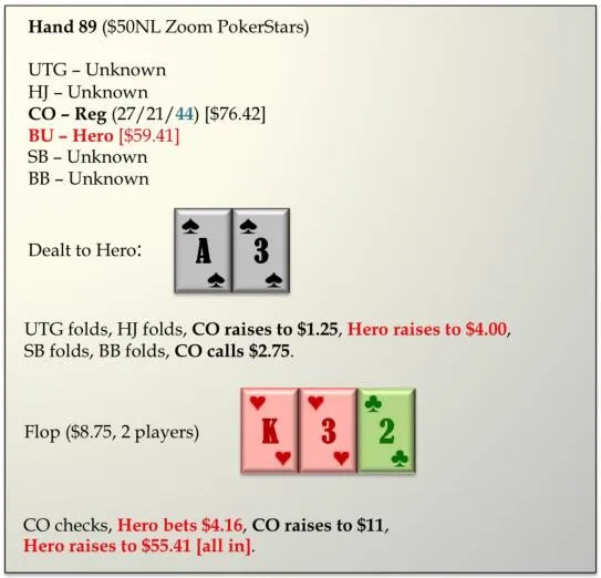 给学生的总结:你在确认我们必须在这里积极防守方面做得很好,但在有利位置对某个激进的对手全压并非EV最高的玩法。