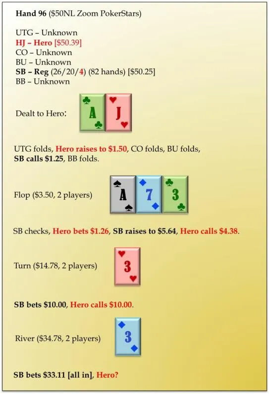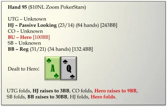 好了,这就是游戏AQo的要旨。这手牌不难游戏,除非我们不知道它的优缺点。概念也不是很困难:对手可能的范围变得越紧,这手牌就变得越糟糕。既然我们已经确定了这些法则,我们就可以将它们应用到当前局面中。