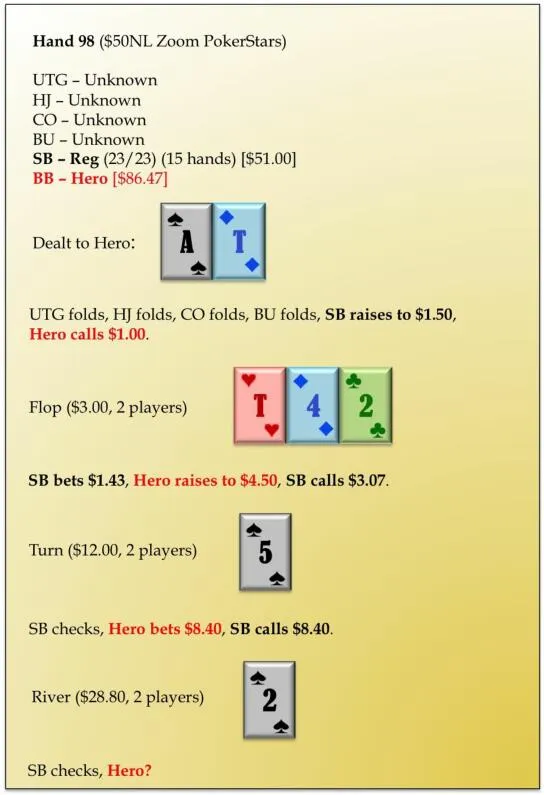 我们如何处理持久战局面将决定我们的盈利线看起来多健康,以及我们的数据在我们将来在相同场合遇到的其他常客玩家看来多不可剥削。持续战局面中存在的大漏洞可能是致命的。我有一些“大盲位置对小盲玩家偷盲的弃牌率”(BB fold vs SB steal)数据约为60%的学生。他们在牌局前期已经输掉这场持久战,其他常客玩家将舔舐他们贪婪的嘴唇,因为他们收集到了Hero糟糕的过度弃牌数据。