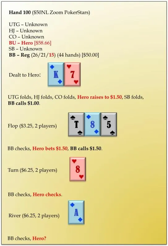 这张A可能看起来在引诱诈唬,但我们现在必须控制自己。我们的范围非常非常宽,且仍处于劣势,特别是在我们转牌圈随后check后。虽然对手的河牌圈check也限制了他的范围,但他会用一些零摊牌价值牌领先下注,而且足够防守河牌圈下注。我们用超过500种组合看到这张河牌,因此很容易过度诈唬。如果对手怀疑我们可能过度诈唬,他的过度跟注可能起到很好效果。如果我们用K7o诈唬,考虑到我们可以使用的所有摊牌价值更小的牌和阻断牌效应更好的牌,我们绝对是过度诈唬。