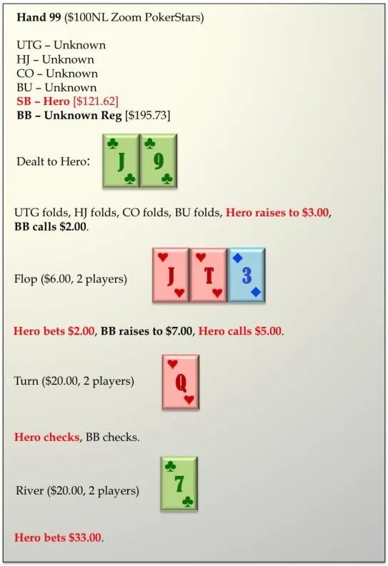 我在这里会用J9 check-call。这手牌对抗对手本会弃牌的范围不易受伤害,而且我们以这种方式对抗一些卡顺听牌可以像下注那样轻松打入资金。通过从我们下注范围中移除类似这样的牌,我们用更健康的跟注牌保护了我们的check范围,也为我们下注更大的真正价值下注牌扫清障碍。