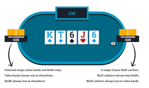 这个描述的模型连同所有假设有时候被称之为完美的两极化模型。花点时间确保自己对这些牌况有个很好的了解,因为在关于扑克GTO的讨论中它会频繁出现。