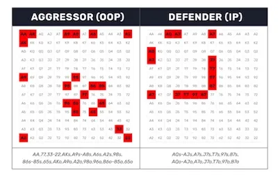 弱AX(一对)。这些手牌均使用一个小额尺度的纯粹策略。道理也很简单,在捍卫范围中如果它们碰到较强的手牌并不想输太多。