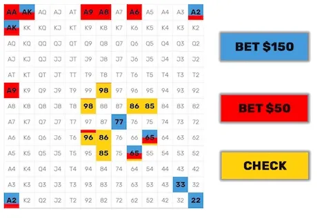 AKo&AKs(强口袋对子)。混合了小额下注和超额下注两种尺度。这就说明两种行动的EV必须是相同的。