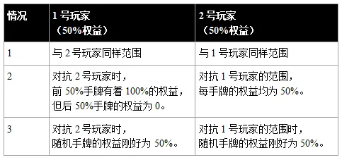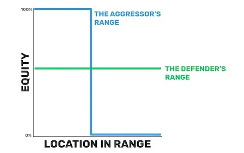 捍卫者权益的线完全是水平的并且位于整个权益分布图的中间。这是因为捍卫者范围中的每一手牌在对抗激进者的全部范围时都有着约为50%的权益。