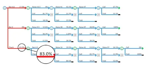 虽然我们最强的手牌几乎总出现在大额下注尺度的范围,但出于范围保护解算器会将他们归入较小额的下注范围。然而,我们较弱的中等牌力手牌有着100%的过牌率,因为作为大额下注尺度范围的一部分它们难以有好的发挥。