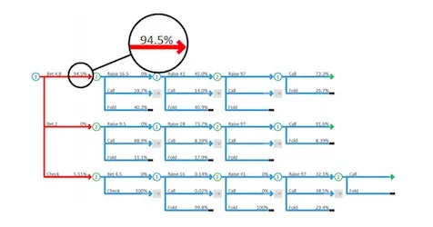 正如预判的那样,解算器只会使用较小额的下注尺度,并且概率在24%左右。