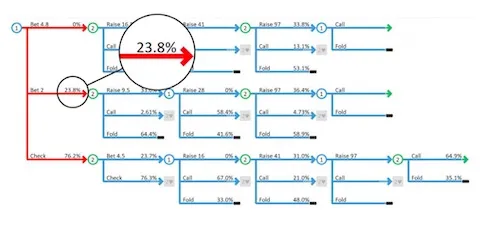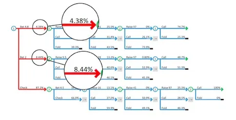 其次,我们的部分非坚果手牌依然强到足以对抗对手范围中较弱的手牌。基于这原因,解算器也会有8%的概率进行小额尺度下注。