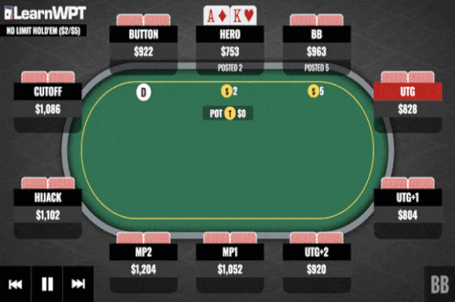 鉴于这个再加注的较小尺度,AK往往不太可能在按钮玩家的范围中(做小额加注的牌手往往希望自己被跟注,因此他们通常有一手希望其他人跟注的牌)。我们没有领先那个范围,而我们几乎没有任何机会通过再加注迫使对手放弃那个范围。另外,枪口玩家也可能拿着一手大牌。