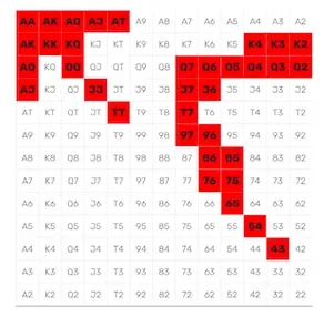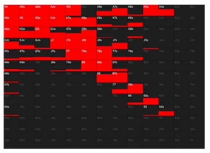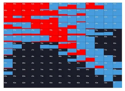 比如,仔细看下面这个来自GTO解算器的翻前范围。红格子中的手牌为3bet,蓝格子中的手牌为跟注: