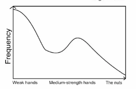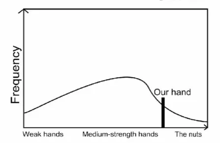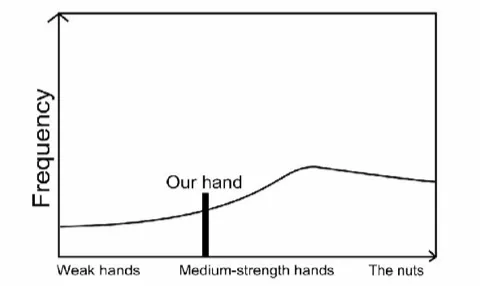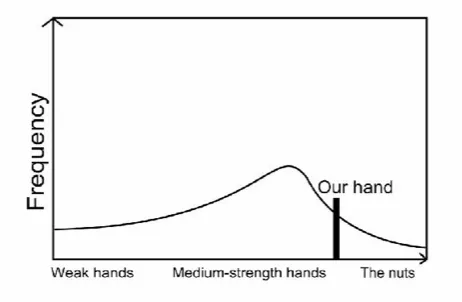 这张图表呈现了相对多的弱手牌或诈唬牌,以及相对多数中等牌力手牌,和少数极强手牌的范围。注意如果我们基于自己手牌牌力画一条垂直线,那么垂直线左侧曲线部分表示我们可以击败的范围,垂直线右侧区域表示是能够击败我们的范围。