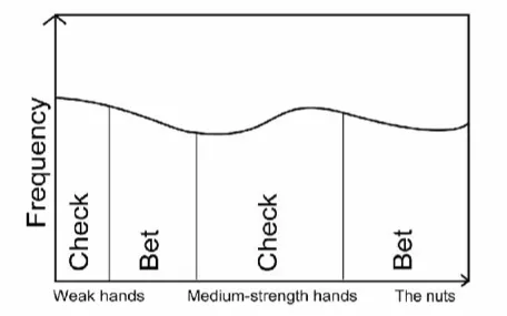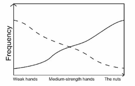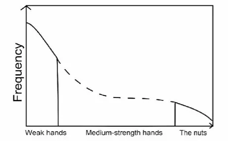 如果对手的范围是强劲的,如图表中的实线,你准备通过引诱一个下注来两极化他的范围,他的两极化范围也可能是强劲的,因为范围中强劲的部分远大于较弱的部分。这很大程度上简化了你的决策制定:如果他下注,你弃牌;如果他过牌,你知道他有一手中等牌力手牌,你看着自己实际的手牌和之前的范围思考着应该下注多大尺度。
