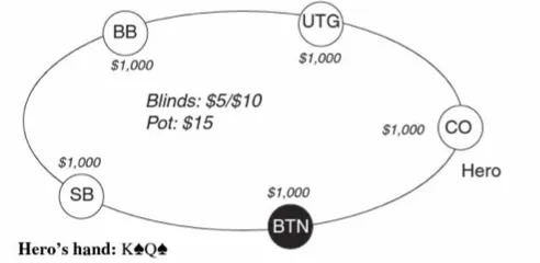 那么,我们的对手该怎么办?在较早的下注环节改变他的策略是可能的,但困难在于如何正确看待每一张可能出现的河牌。所以,大盲位的第一应对方案应该是警惕这个河牌圈的诈唬。通过尽量的不诈唬,大盲位玩家可以协调好自己的范围(我们会在后面进一步讨论范围协调的话题)。