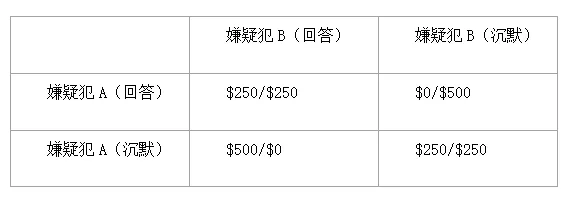 警方盘问两名嫌疑人。他们可以决定回答或保持沉默。如果他们都保持沉默,他们每个人不得不支付250美元的罚金。如果他俩都选择回答,他俩也不得不支付250美元的罚金。但如果其中一人选择回答,另一人保持沉默,回答的那位不用支付一分钱,但保持沉默的那位必须支付500美元的罚金。他俩不能对选择进行交流。