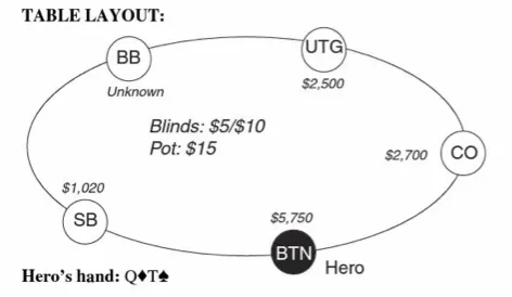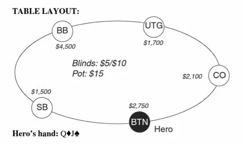 对于Q♣️J♥️这手牌,我们在本章开头的案例中已经讲过,如果小盲位进入底池,我们会变得郁闷:虽然Q♣️J♥️听牌会击中一些顺子,数目少于J♥️T♥️,在深码底池中非同花手牌显然是一个重要因素。小盲位选手进入底池的另一个风险就是他的手牌可能是AQ、AJ、KQ或KJ。在深码案例中,一张Q或一张J出现在翻牌圈都是一个极其糟糕的结果。