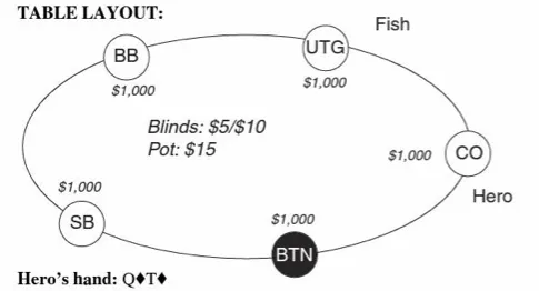 我们选择在平跟枪位选手,因为他是一名弱者选手并且我们相对于他有位置优势。同花QT并非是一手好牌,但当你比弱者玩家有位置优势时足以好到可以继续行动。