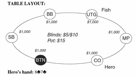 不幸的是,这也给了庄位玩家一个非常好的入池底池赔率。小盲位选手下注$5,而大盲位玩家免费进入翻牌圈。这意味着此时我们和鱼类玩家(UTG)以及另外三位强者选手进入翻牌圈。
