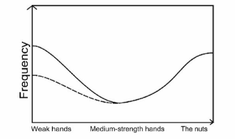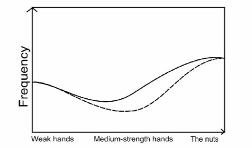 这说明对抗两极化疯狂型选手(诈唬频繁),我们可以添加手牌到我们的诈唬范围。因为他只会添加非常弱的手牌到他的范围,他无法通过频繁地跟注我们的加注来剥削我们的额外诈唬。但对抗一名非两极化疯狂型玩家(用中等牌力手牌频繁加注),如果我们添加手牌到我们的诈唬范围,我们会被可以击败我们诈唬牌的手牌频繁跟注。所以如果对抗这类型玩家时我们想要提升自己的再加注范围,最好就是添加中等牌力的手牌,而非是诈唬牌。