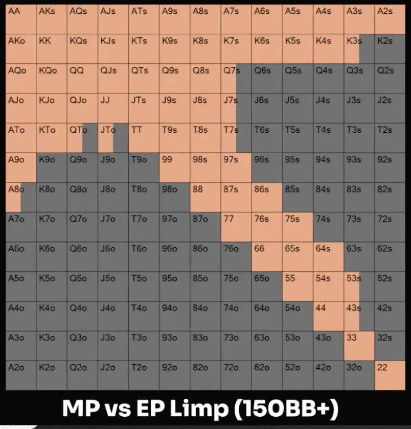 以下是Darren Elias对于150bb筹码深度下,在中间位置对抗前面位置的平跟溜入弱玩家的剥削范围。
