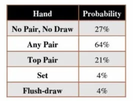 在这手牌中我们击中了顶对。如果我们加注权益,我们会被更好的JJ、顶对和一些A-X牌组跟注。假设大盲位的范围同样为88+、AQo+、ATs+和KQs,我们能够计算出它们成牌时的概率: