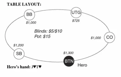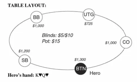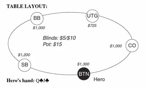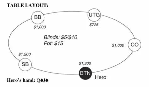 所以这里的全压是有利可图的,我们需要对手的弃牌率在67%的样子。此时我们保守估计他不会弃掉同花听牌、顶对或暗三条,所以他需要游戏自己至少29%的手牌。这就意味着如果对手就算用牌力低于顶对的任何手牌跟注,比如QQ或AQ,全压都是无利可图的。