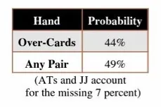 如果我们的对手会用他的全部范围跟注全压,我们的权益就是67.5%,全压是非常有利可图的。如果他只会用对子或暗三条(88+,AJs)跟注,我们的权益就是55.2%,全压仍然是有利可图的。